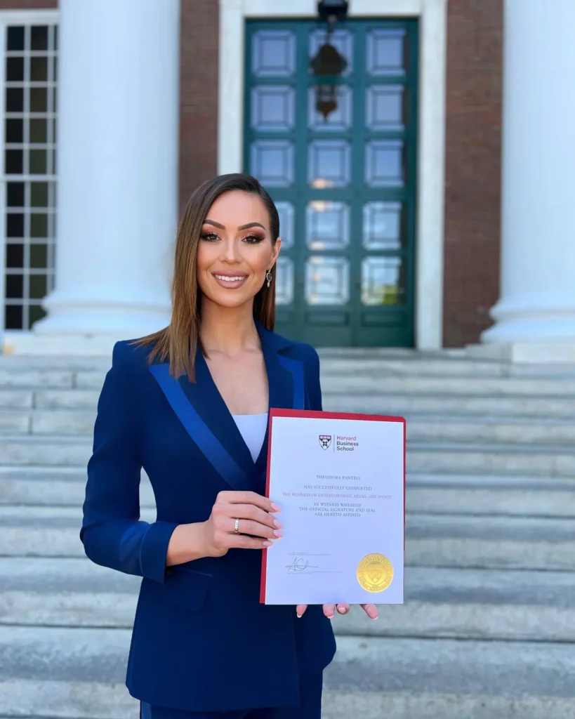 She later completed a master’s degree in clinical psychology and serves as an assistant professor in psychology at a university in Athens. In 2023, she attended Harvard Business School’s “The Business of Entertainment, Media & Sports” program, a highly competitive course for global industry leaders.