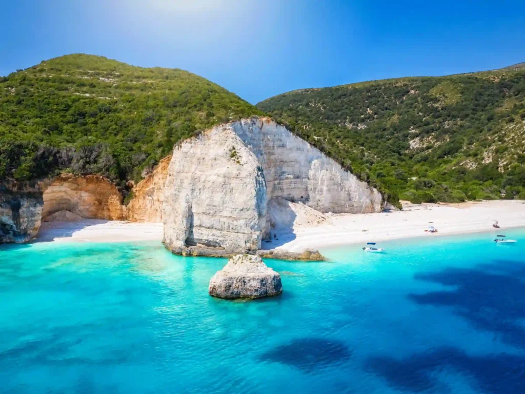 Tucked into Kefalonia’s rugged Ionian coastline, Fteri Beach offers Greek island bliss in a compact, horseshoe-shaped cove that’s pure relaxation gold.